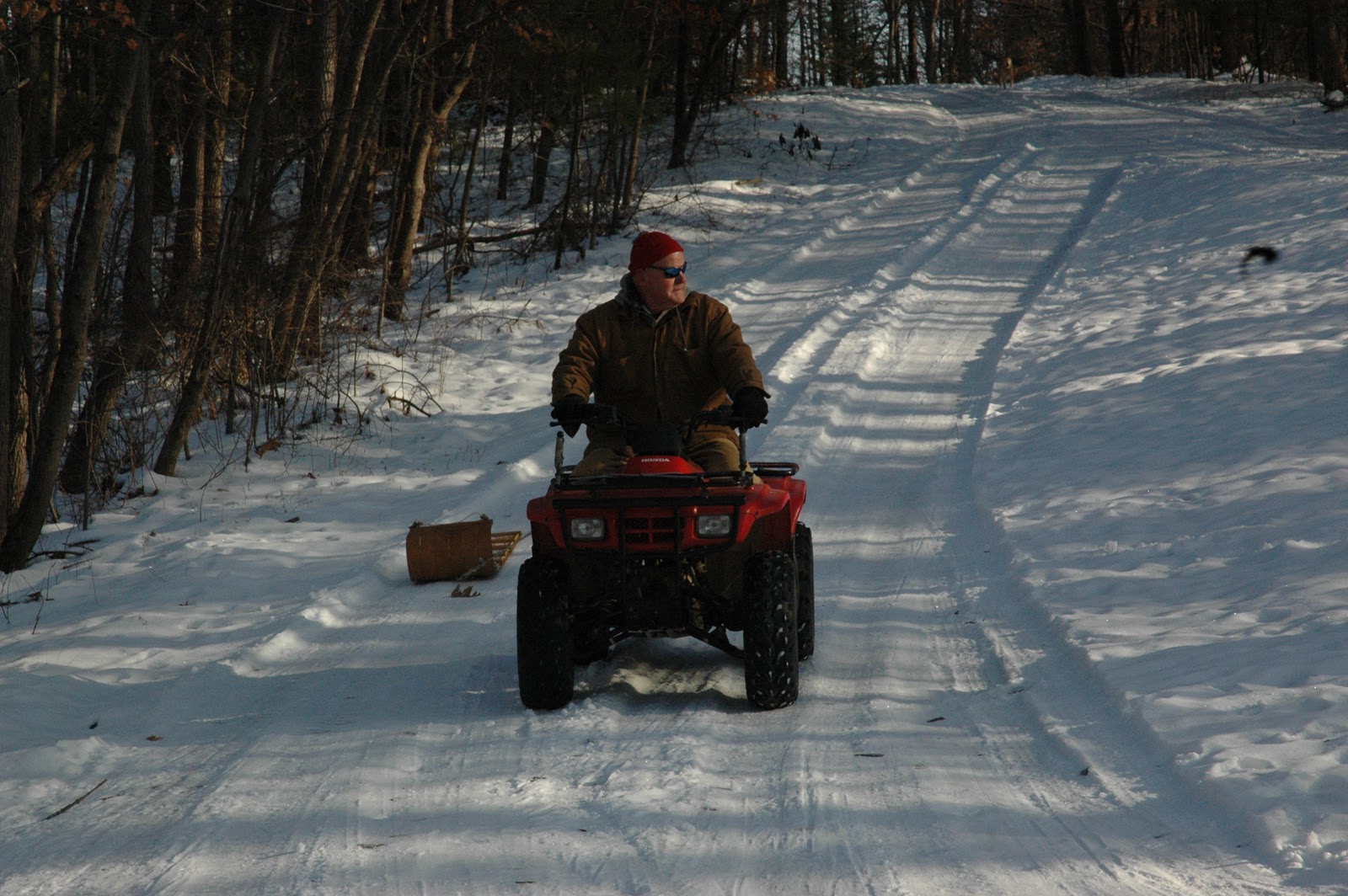 When Uncle Creepy heard we were sledding he suited up in his Carharts and came over pulling the toboggan behind the four wheeler (or "Scrambler" as we call it in our family).  He took Carter for a ride but when Carter slid faster than the Scrambler down the hill he wasn't too thrilled with the thrill ride.  Instead, they just went for a Scrambler ride.  Carter refrained. :)